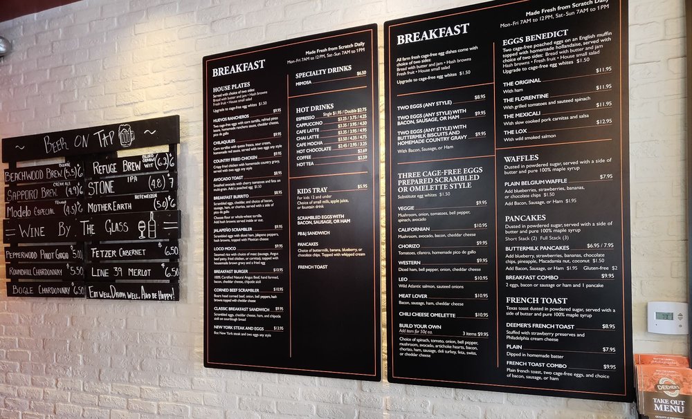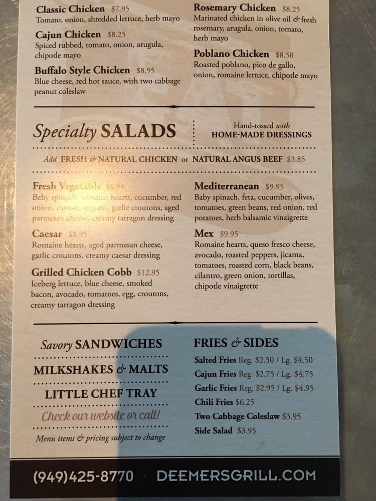 Deemers American Grill located in Laguna Niguel, CA, offers a variety of options such as burgers, sandwiches, and appetizers. Known for their Angus burgers, the menu includes popular options like the Napa Burger with goat cheese and pesto mayo. Customers praise the fresh ingredients and quality of their meals, with a special mention of the friendly staff. With a diverse menu that caters to both meat-eaters and vegetarians, Deemers provides a casual dining experience suitable for groups, kids, and even dogs with outdoor seating available. The extensive breakfast menu and expanded hours make it a go-to spot for any meal of the day. Additionally, the restaurant offers convenient amenities like delivery, takeout, and catering services, ensuring a pleasant dining experience for all customers.
